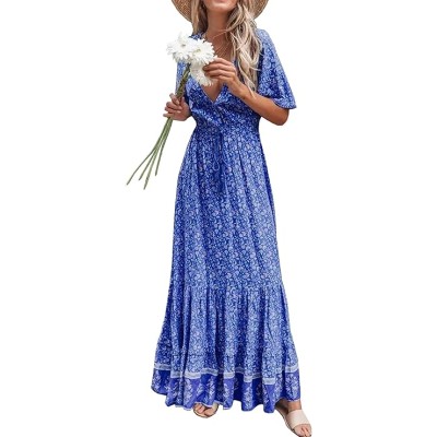 Womens Summer Cotton Short Sleeve V Neck Floral Print Casual Bohemian Midi Dresses