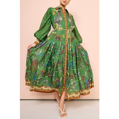 Women's Long Sleeve Dress Printed Cardigan Chiffon Dresses High Waist Lace-up Maxi Boho Dress