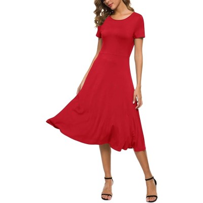 Women's Casual Round Neck Short Sleeve Midi Dress Solid Stretchy Waist Knee Long Dress