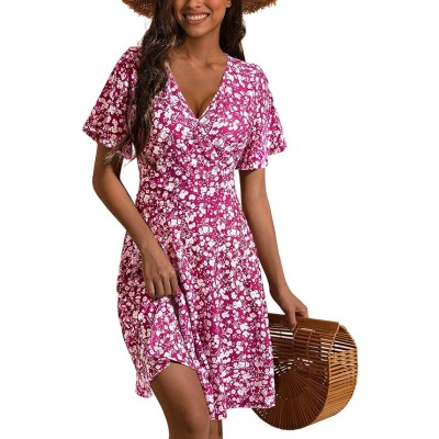 Womens Sundress Summer Floral Short Sleeve Wrap V Neck A-Line Midi Dress