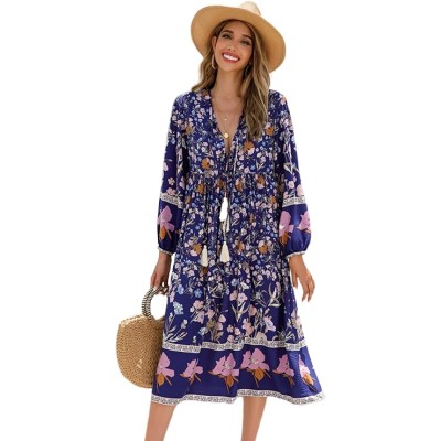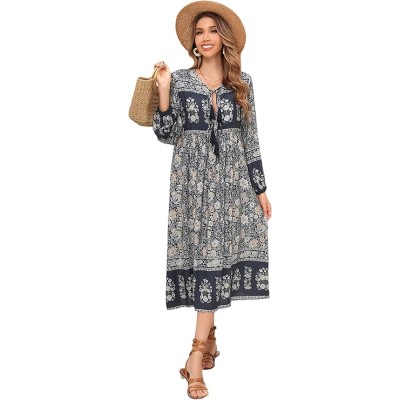 Women's Summer Midi Dress Vintage Floral Print Beach Boho Casual Long Sleeves Flowy Dress
