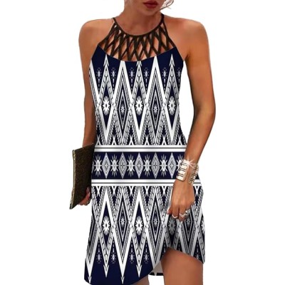Casual Floral Hollow Out Halter Neck A-line Cold Shoulder Sundresses for Beach Vacation