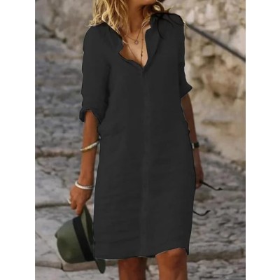 Women's Casual Cotton Linen Shirt Dress Button Down 1/2 Long Sleeve Lapel V Neck Summer Midi Dresses with Pockets