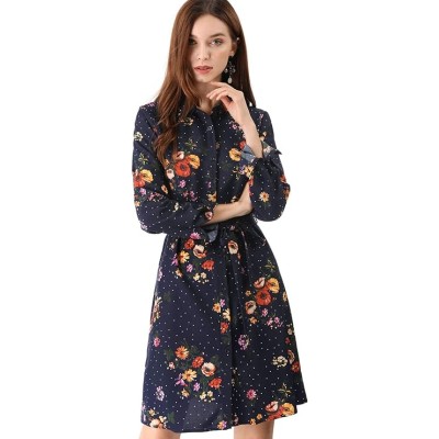 Women's Floral Button Down Vintage Polka Dots Dresses Collar Tie Belted Shirt Dress