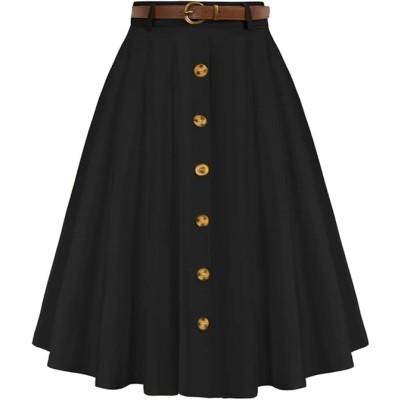 Vintage Stretch High Waist A-Line Flared Midi Skirts with Pockets & Belts