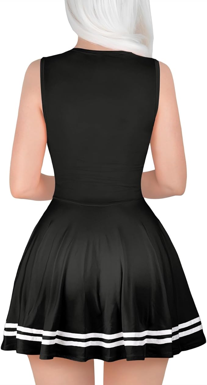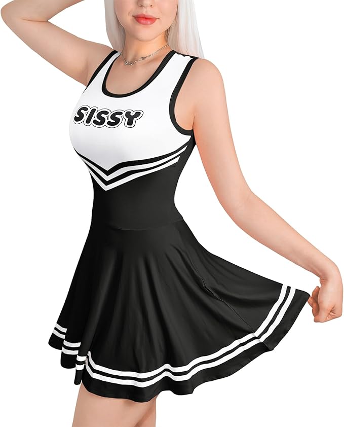 This eye-catching black sleeveless dress is designed to showcase your bold fashion sense. It features a lively black color block print adorned with “SISSY” lettering and charming stripes.