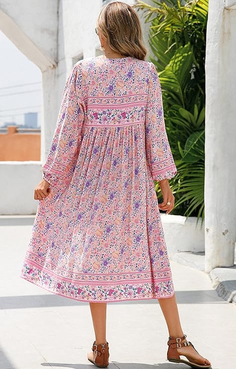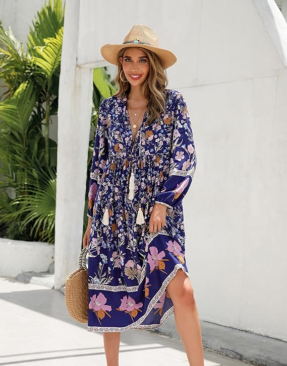 Flowy Printed Dress with Long Sleeves, Suitable for: Daily , Vacation, Beach etc.