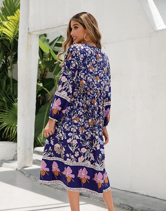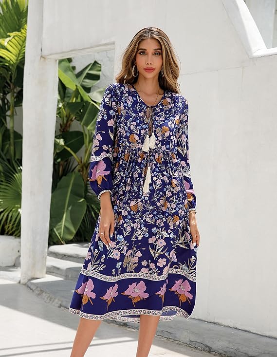 Beautiful Bohemian Midi Dresses with a Deep V-neck and Front Tie at Neckline